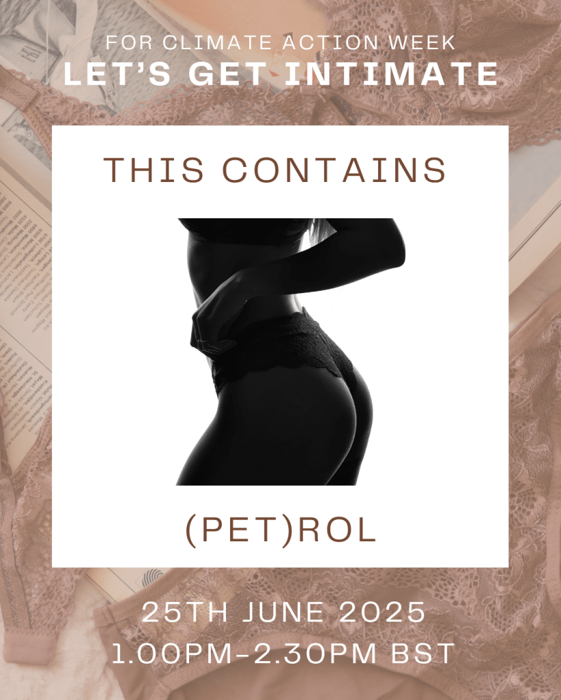 Join us on Climate Action Week on 25th June 1:00pm – 2:30 BST for a live discussion on intimacy and climate change in “Let’s Get Intimate”. Get your tickets here. The tickets are donation-based, it is recommended you pay minimum £5 to support the work.